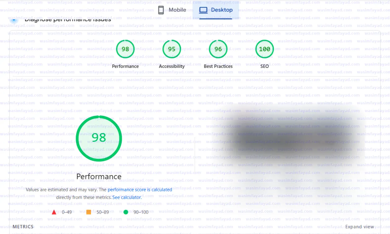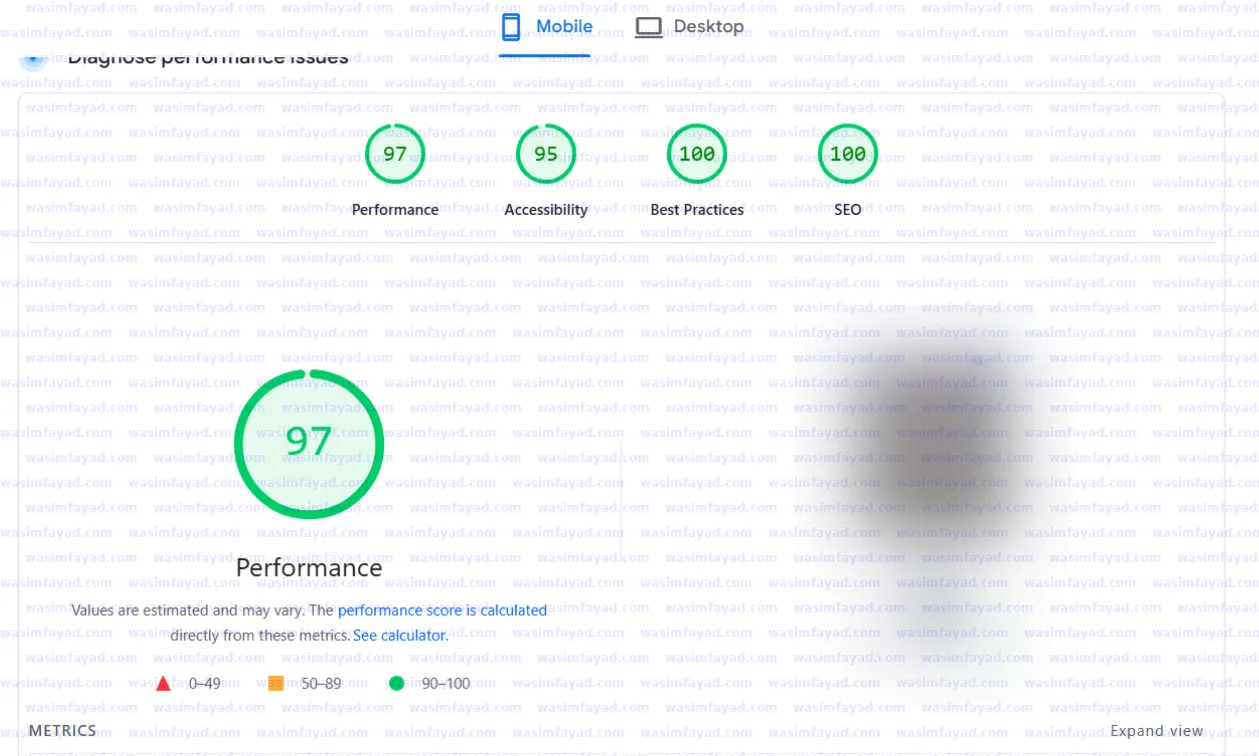 97 performance on mobile, 98 on desktop